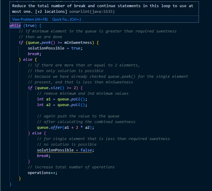 vscode tells me to reduce the total number of break and continue statements in this loop to use at most one,
