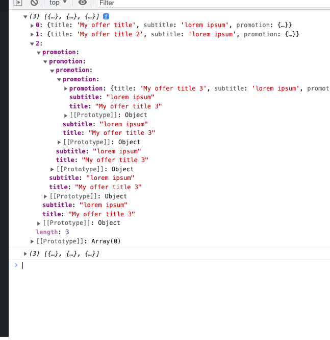 I have some javascript where I’m trying to create a promotion within each of my promotion items. Right now though, for some reason it keeps on nesting itself indefinitely, and I only need it to contain one reference (see screenshot)