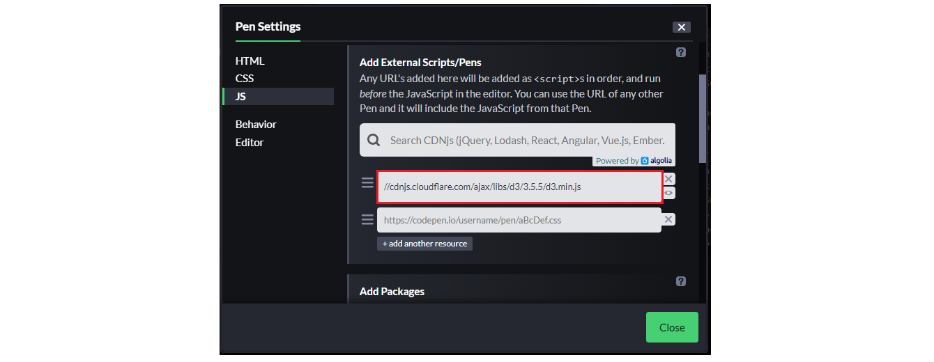 - Check the "Add External Scripts/Pens" field to see the CDN references added to the project.
