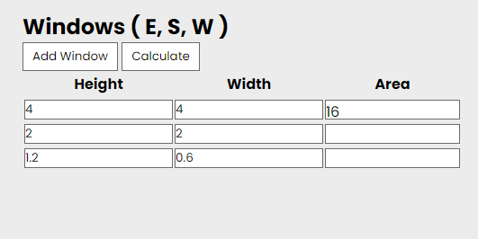 I though I might add also, if I start fresh with one row, then add the height & width, then click calculate. Then, click add window, then add the width & height, then calculate again. it works.