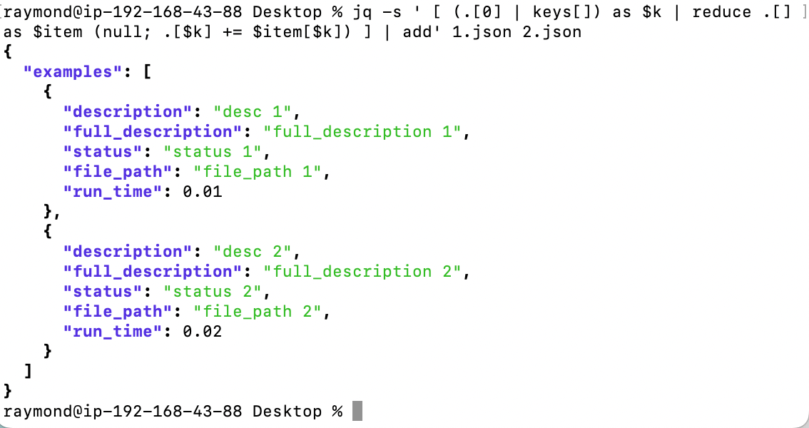 i have tried using this script jq -s ‘.[0] * .[1]’ report1.json report2.json but it doesn’t work, is there any solution to be able to combine according to my expected result using jq command ?