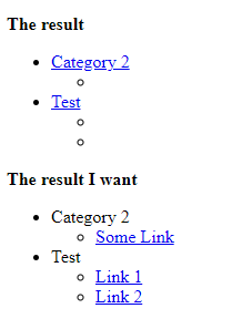 I am trying to bend some existing code with my limited jQuery knowledge, be nice, im learning, I am trying to make a nested list with links, the end result would be the top level of the list being "category" then a nested UL with links using "url" and "text".