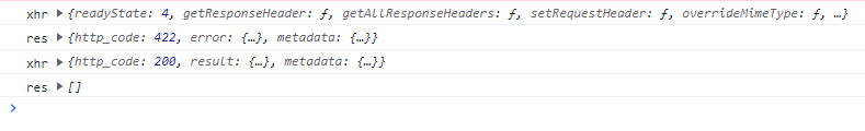 In the print screen of the console the first two lines are the first request (which returns HTTP 422). The XHR is the xhr object as expected