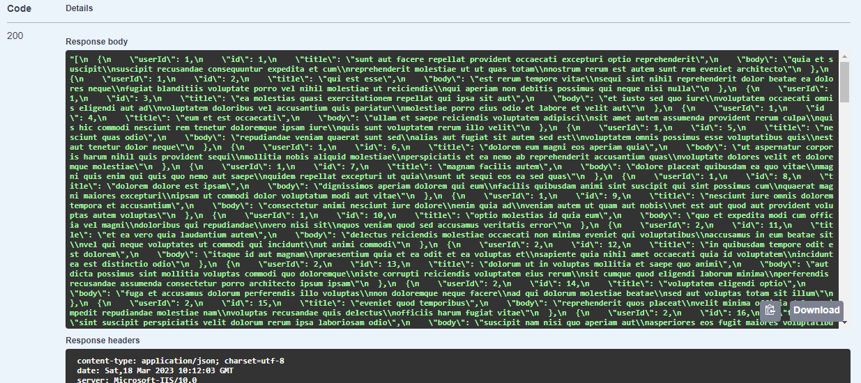 I am using jsonplaceholder api to show the result output. The api I will be using header with token and (Accept : "application/vnd.api+json"). I tried adding this but it gave me media not support error.