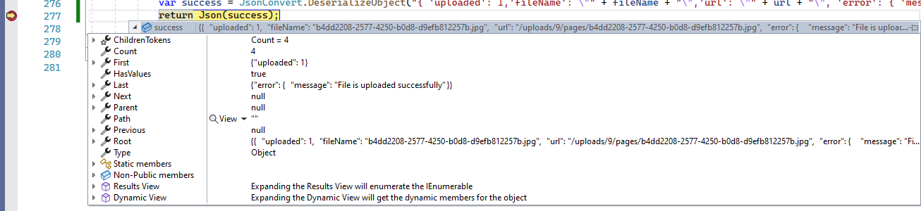 var success = JsonConvert.DeserializeObject("{ 'uploaded': 1,'fileName': \"" + fileName + "\",'url': \"" + url + "\", 'error': { 'message': \"" + successMessage + "\"}}");