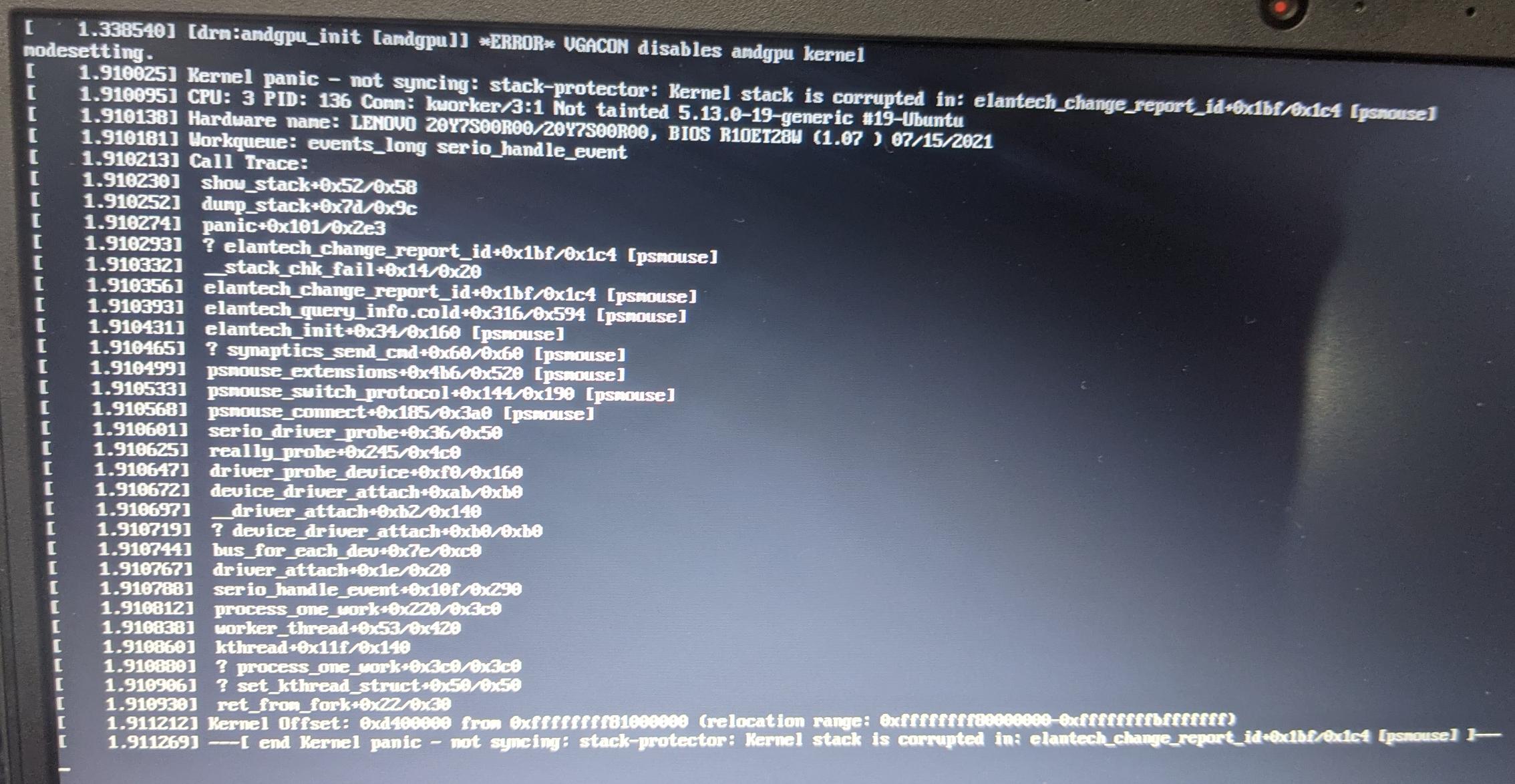 I’m trying to boot the latest Ubuntu 21.10 on Lenovo ThinkPad E14 (Ryzen 3 5300U with integrated Renoir graphics), and I’m stuck on Lenovo logo. When trying to boot with safe graphics, I got the following error: