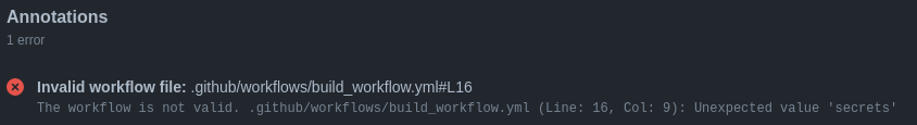 Error: The workflow is not valid. .github/workflows/build_workflow.yml (Line: 16, Col: 9): Unexpected value ‘secrets’