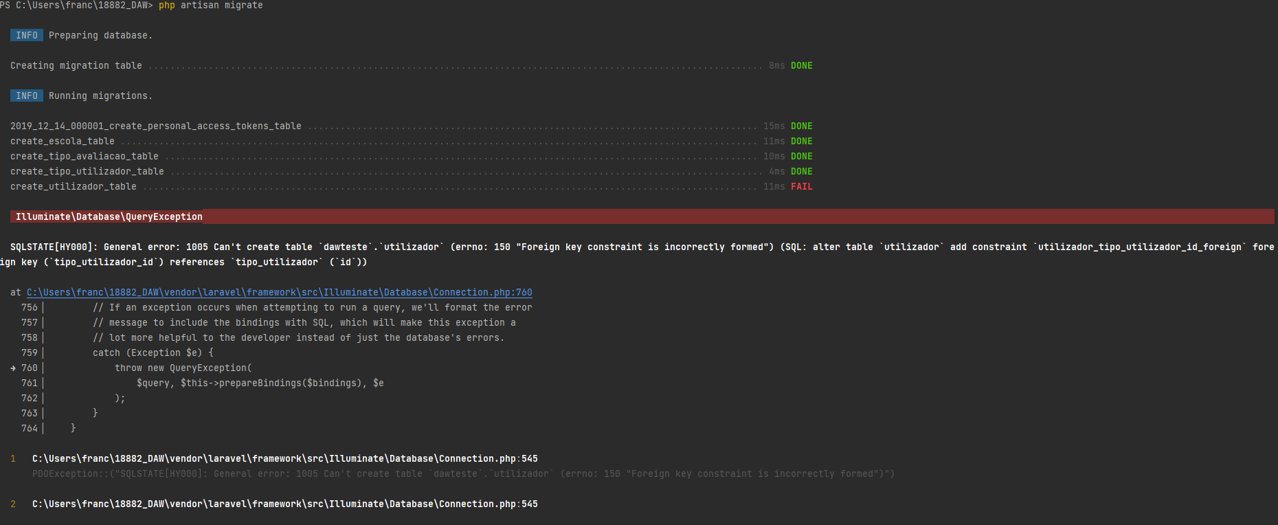 dawteste.utilizador(errno: 150 "Foreign key constraint is incorrectly formed") (SQL: alter tableutilizadoradd constraintutilizador_tipo_utilizador_id_foreignfore