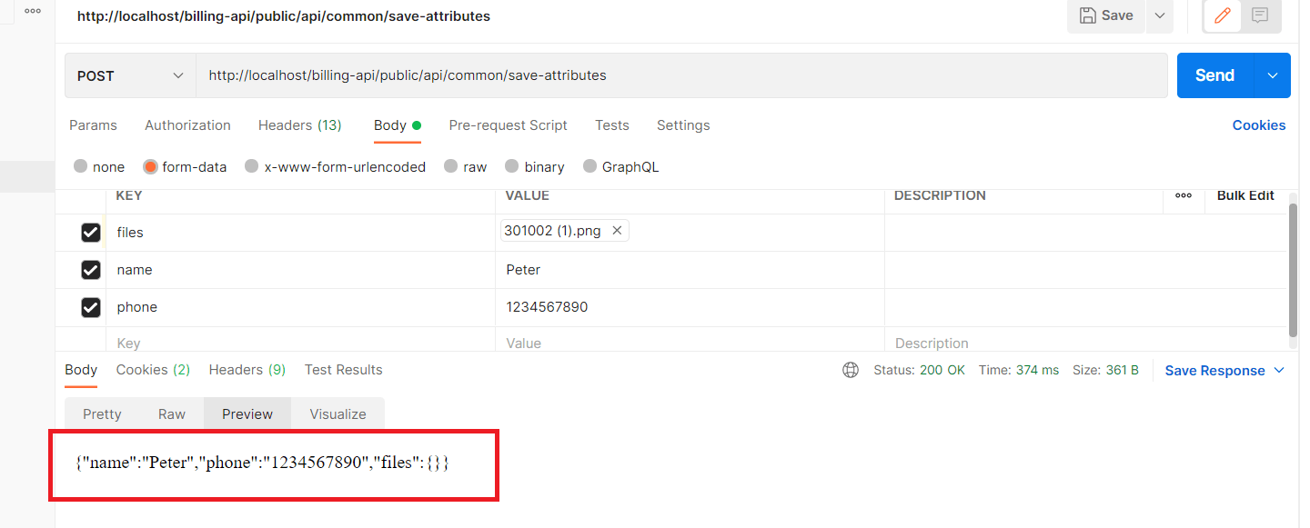 File value is always empty. Is there any I am missing. Attached is the postman sample. Seems like some configuration issue at Laravel API. Unable to find that.