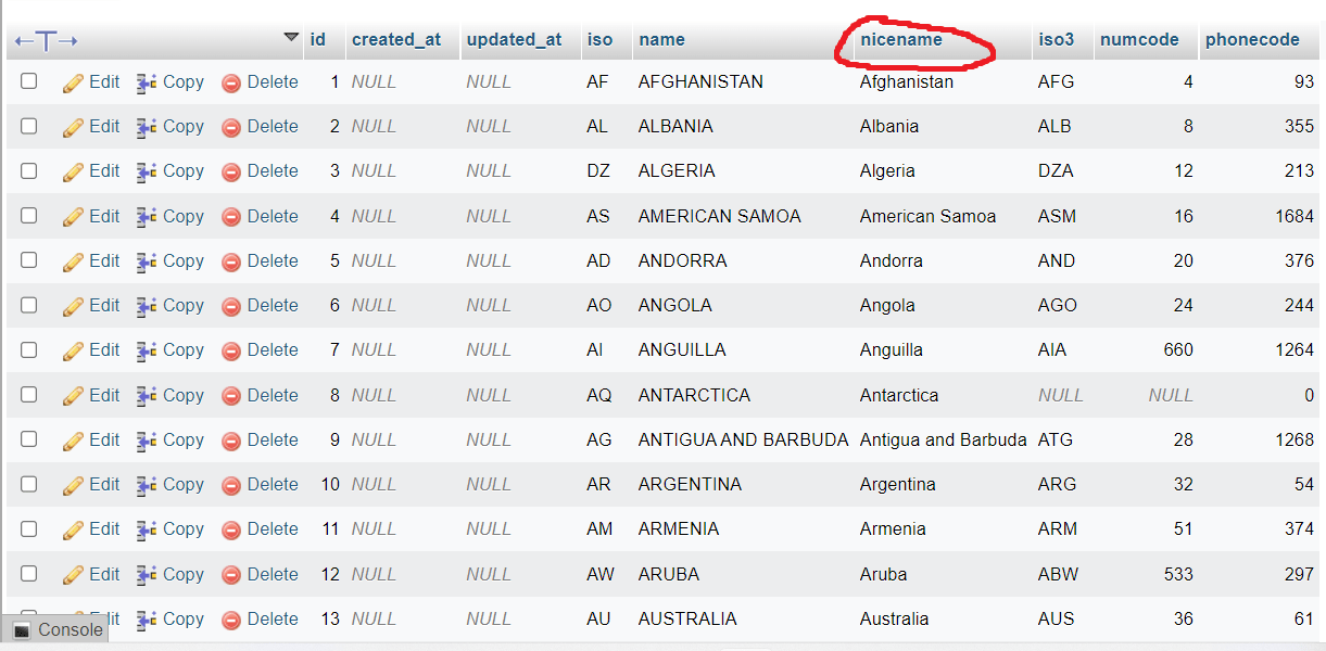 I have an option list in my front end and the data is retrieved from the DB table, named countries and nicename column.