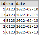 You can utilise row_number(). From your limited sample data it looks like you want the lowest-Id values per SKU, amend the order-by criteria if that’s not correct: