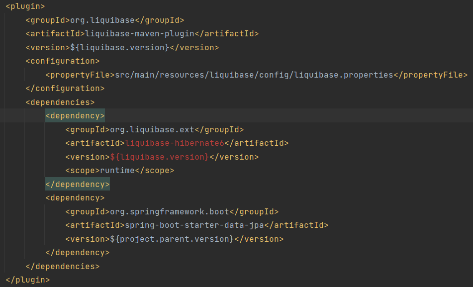 I’m trying to use Liquibase with the liquibase-maven-plugin in a Spring Boot app and as a dependency I require the liquibase-hibernate6 jar, which helps with writing the differences between the database schema and the local project annotations. The version 6 of the dependency is suited for Hibernate 6.x.x version. However, when I attempt to do mvn dependency, nothing gets downloaded and in the same time I see the dependency’s groupID and version in red, resulting the error Dependency 'org.liquibase.ext:liquibase-hibernate6:4.18.0' not found. This is the current plugin configuration: