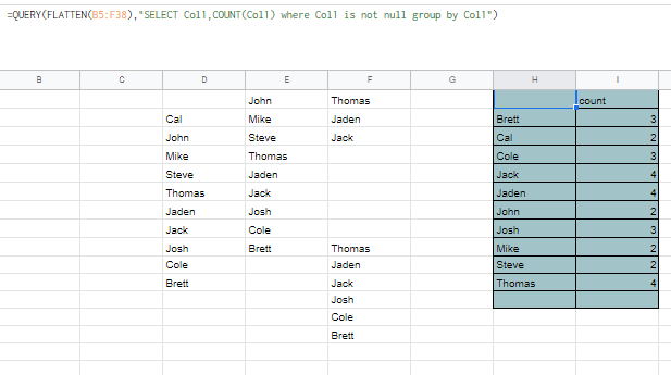 =QUERY(FLATTEN(A2:F),"SELECT Col1,COUNT(Col1) where Col1 is not null group by Col1")