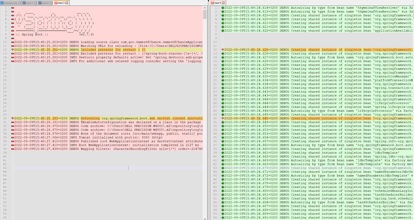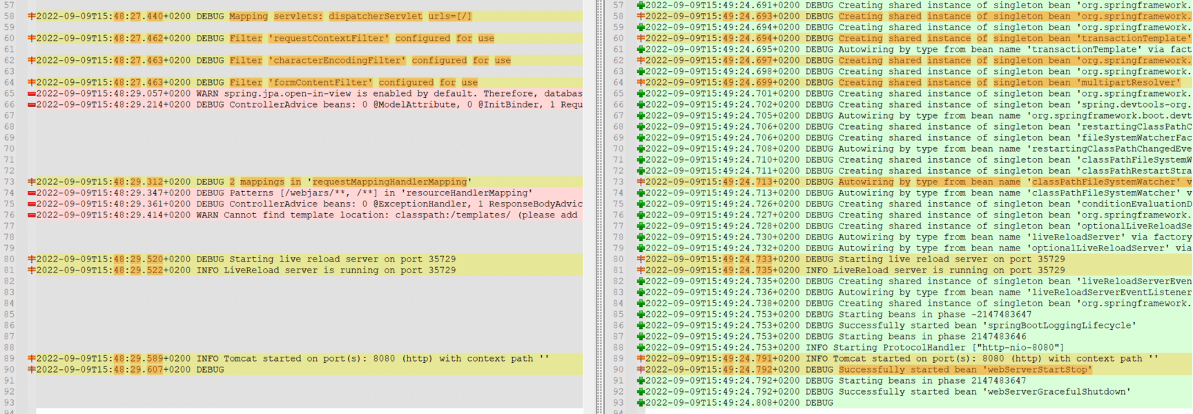 So in one example I have ~1150 lines and with other approach I have ~1200 and they’re mostly identical besides this. And as you can see, when I use trace as logging level, my application doesn’t start with Spring drawing on a first line in a console.