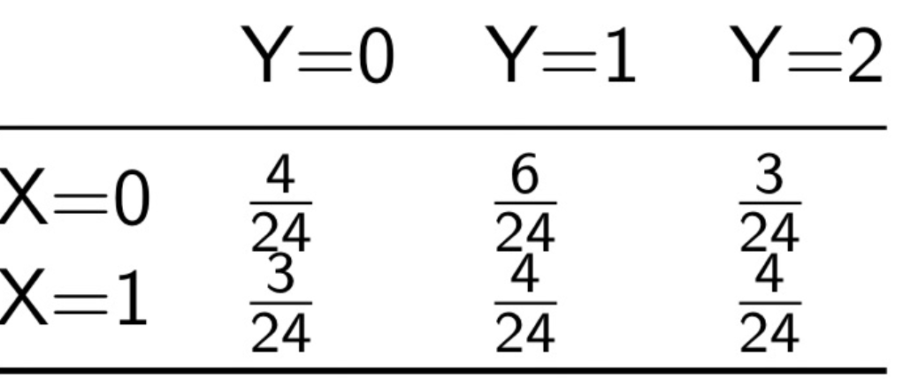 (0 * 0 * 4/24) + (0 * 1 * 6/24) + (0 * 2 * 3/24) + (1 * 0 * 3/24) + (1 * 1 * 4/24) + (1 * 2 * 4/24)