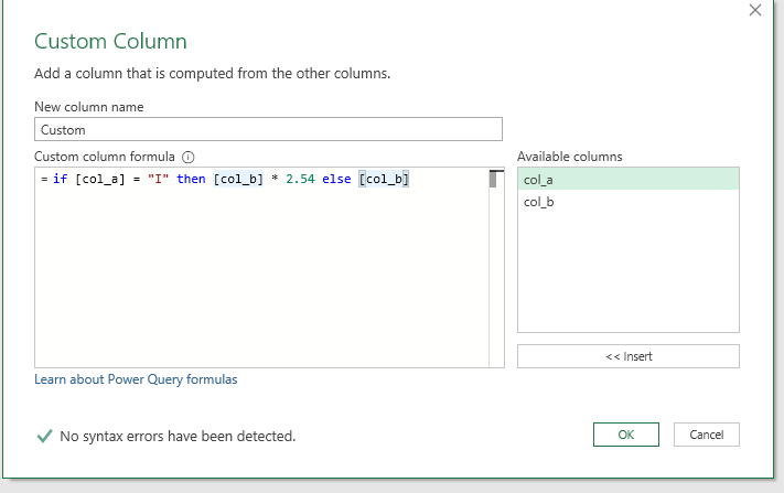 I created a conditional column using dax programming to transform inches to centimeters. However, I must take place in Transform Column. I googled that it is M Code. Do you know how this code would look like in M Code? The intention is to create the column conditonal_column if column_a is I then col_b should be multiplied by 2.45. If it is M then do not make the multiplication.