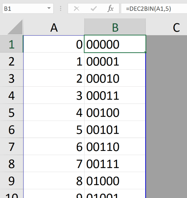 In Excel, make a column with the numbers from 0 to 31. Then next to that, put in DEC2BIN(A1,5) and drag down.