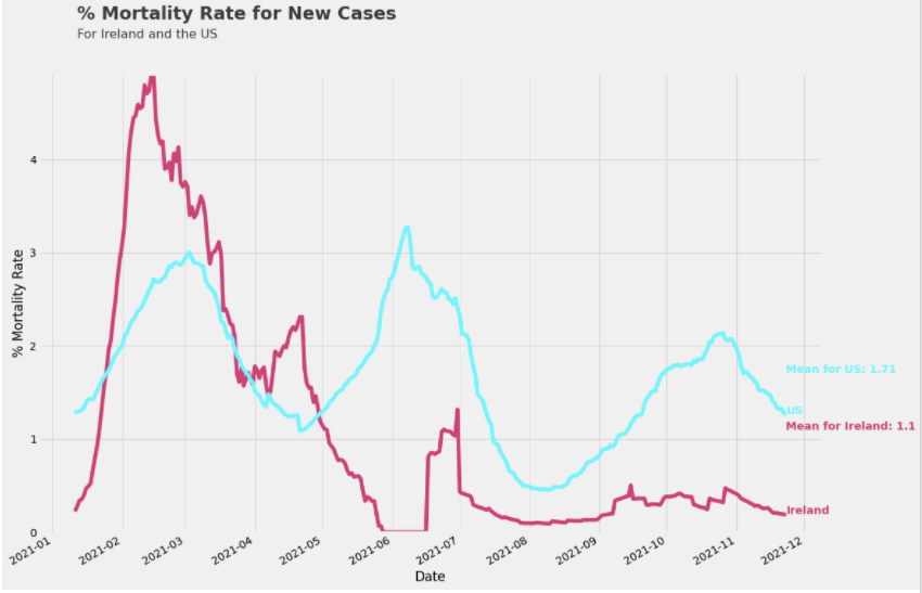 plot.text(x = covid.index[1], y = int(covid.max().max())+1.3, s = "For Ireland and the US", fontsize = 16, alpha = .75)