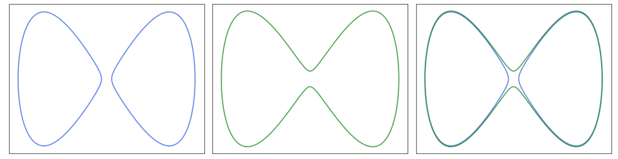 One contour is shown in blue in the figure on the left. The contour consists in two disjoint curves. Another contour is shown in green in the middle figure, and consists in a single curve. Both contours are shown together in the final image on the right.