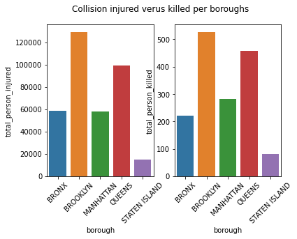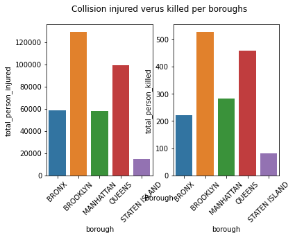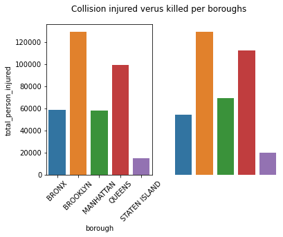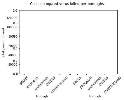 plt.suptitle ("Collision injured verus killed per boroughs")
