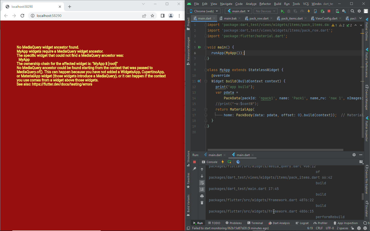 The MediaQuery widget establishes a subtree in which media queries resolve to the given data. MaterialApp introduces a MediaQuery and keeps it up to date with the current screen metrics as they change. In order for MediaQuery.of(context) to work it needs to be in that subtree, and from the previous code sample I provided it clearly is not.
