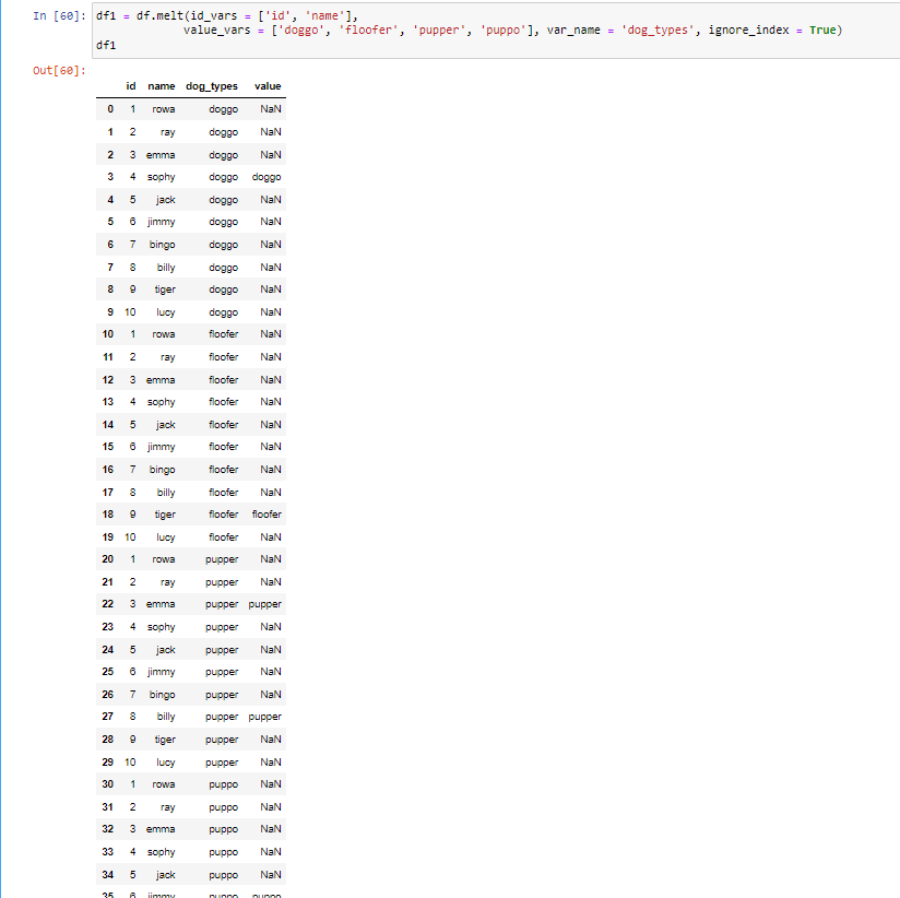 df1 = df.melt(id_vars = ['id', 'name'], value_vars = ['doggo', 'floofer', 'pupper', 'puppo'], var_name = 'dog_types', ignore_index = True)