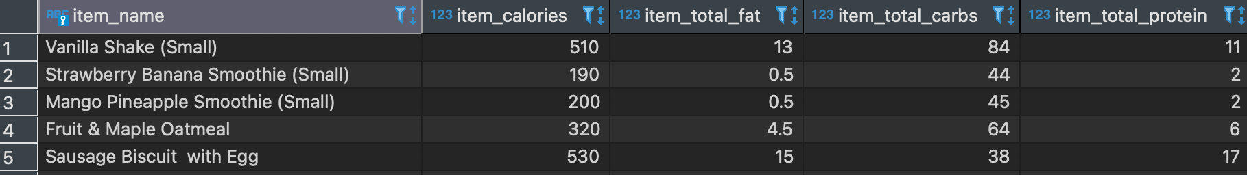 [{'Vanilla Shake': {'Total Fat': '13.4791543506'}}],