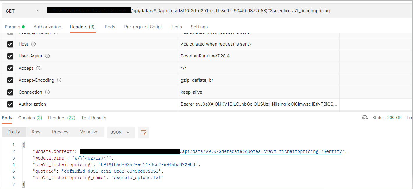 I have a table called quotes. This table has a column of type File "cra7f_ficheiropricing" to which I have previously uploaded a file. Using Postman, I want to retrieve the content of the file as a binary file.
