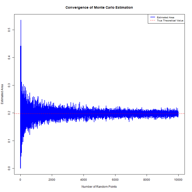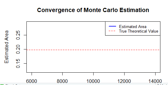 legend("topright", legend = c("Estimated Area", "True Theoretical Value"),col = c("blue", "red"), lty = c(1, 2), lwd = c(2, 1), cex = 0.8)