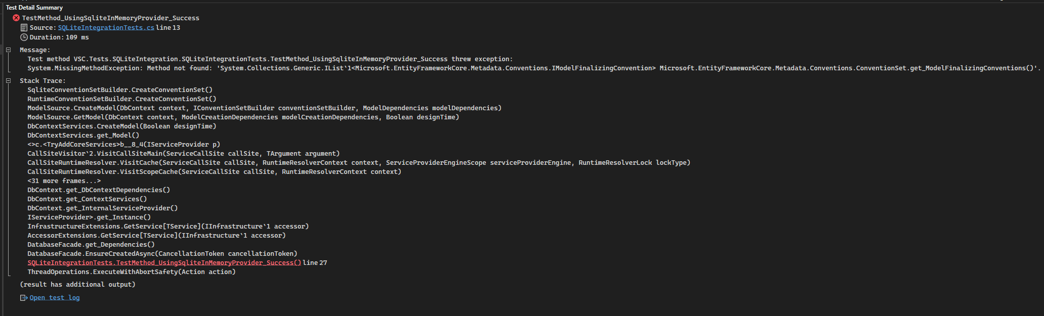 I was using .NET 6 (I still had the error) and thought that it could be some conflict with the nugets I am using in my solution. It turns out that even after updating to .NET 7 the error persists when I run the test. For testing I’m using MSTest Framework and using an inmemory database (sqlite) to make integration tests. The error is happening when executing the line await context.Database.EnsureCreatedAsync();. The test classes are the following: