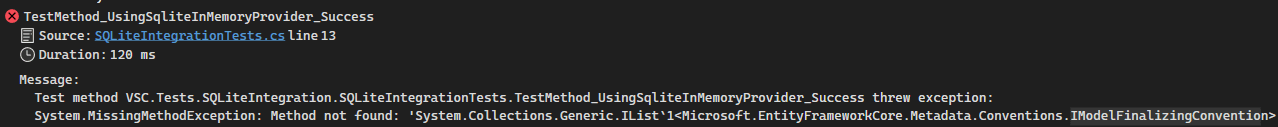 Looks a lot like package version mismatch (in my practice it is the most common source of such errors). Update Microsoft.EntityFrameworkCore.Sqlite to the latest 7th version (my guess is that EF project uses that version) to match major version of EF Core packages in the tested solution.