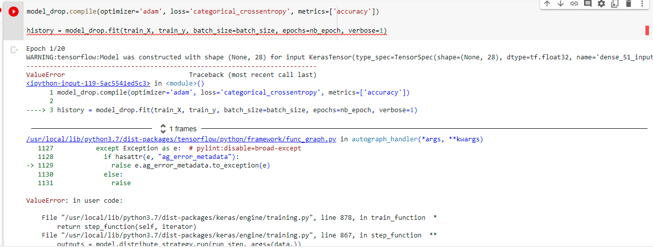 I am getting an error. It says ‘Model was constructed with shape (None, 28) for input KerasTensor(type_spec=TensorSpec(shape=(None, 28), dtype=tf.float32, name=’dense_45_input’), name=’dense_45_input’, description="created by layer ‘dense_45_input’"), but it was called on an input with incompatible shape (None, 28, 28).’