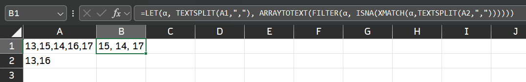 =LET(α, TEXTSPLIT(A1,","), ARRAYTOTEXT(FILTER(α, ISNA(XMATCH(α,TEXTSPLIT(A2,","))))))