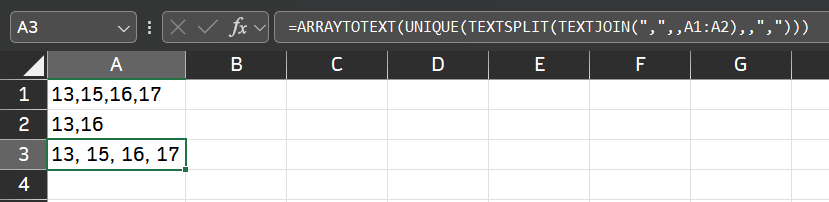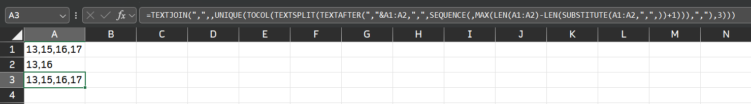 =TEXTJOIN(",",,UNIQUE(TOCOL(TEXTSPLIT(TEXTAFTER(","&A1:A2,",",SEQUENCE(,MAX(LEN(A1:A2)-LEN(SUBSTITUTE(A1:A2,",",))+1))),","),3)))