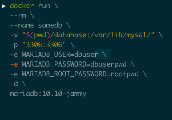 docker run --rm --name somedb -v "$(pwd)/database:/var/lib/mysql/" -p "3306:3306" -e MARIADB_USER=dbuser -e MARIADB_PASSWORD=dbuserpwd -e MARIADB_ROOT_PASSWORD=rootpwd -d mariadb:10.10-jammy