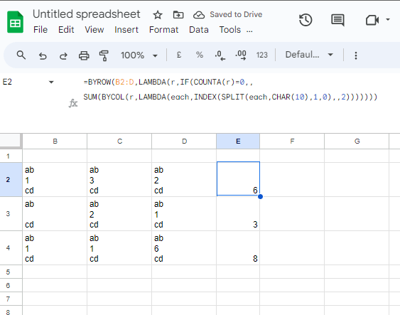 SUM(BYCOL(r,LAMBDA(each,INDEX(SPLIT(each,CHAR(10),1,0),,2)))))))