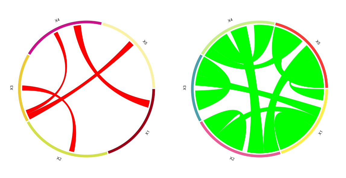 How can I create a second figure that contains 2 chord diagrams, one with each colour category, i.e one chord displaying only the green lines and one displaying only the red lines?