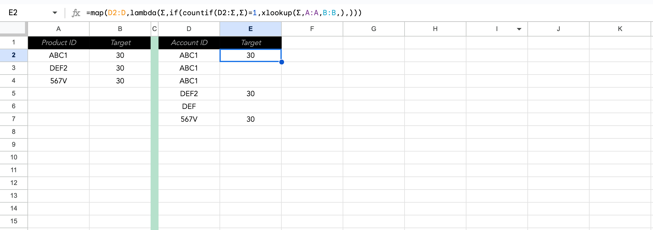 logic: first row of each Product ID is figured by using countif(D2:Σ,Σ)=1 & then using lookup to pull target value when condition is met