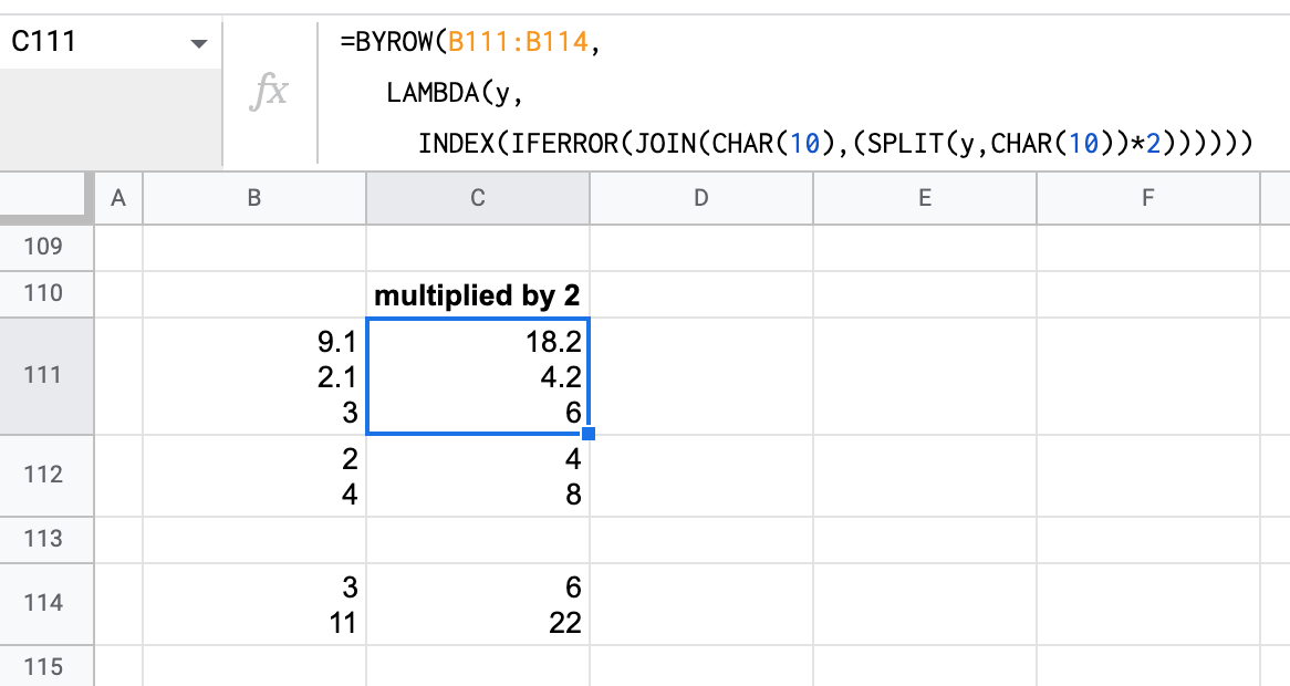 INDEX(IFERROR(JOIN(CHAR(10),(SPLIT(y,CHAR(10))*2))))))
