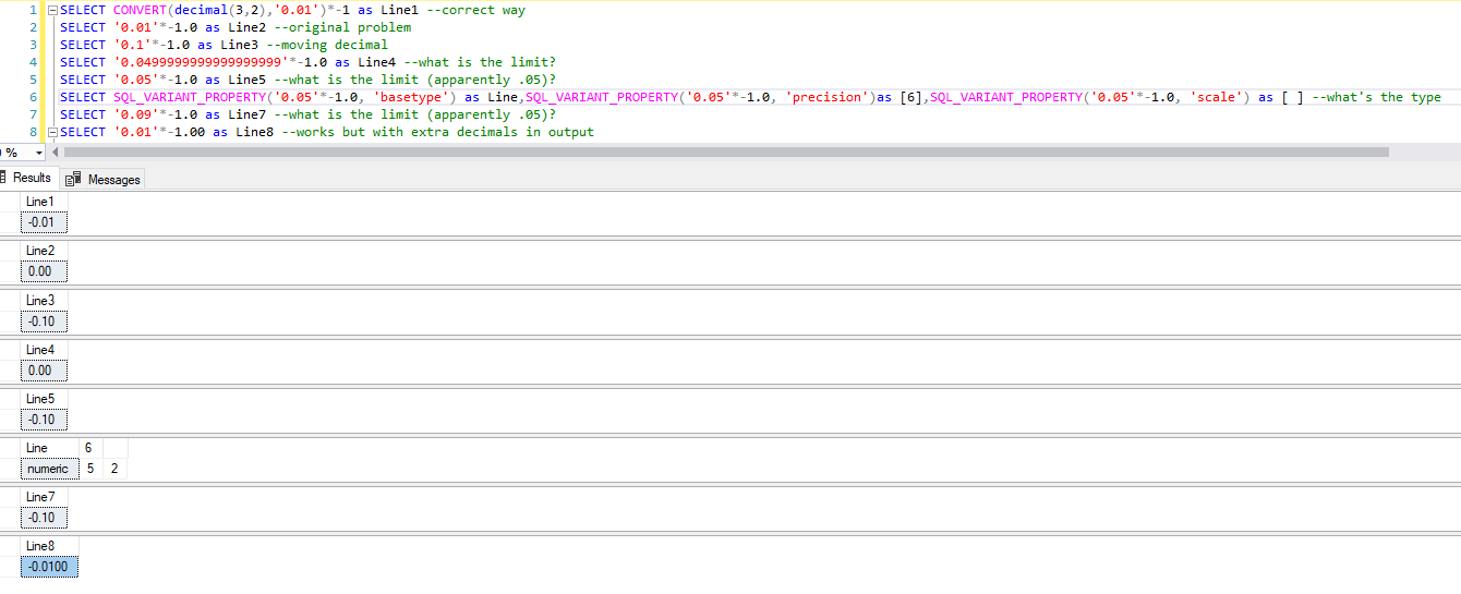 I then started to go down the path of "what is the final value needed before it changes". I incremented the ‘.01’ until I got something, which happened to be ‘.05’. At this point, it returns -.1. Using SQL_VARIANT_PROPERTY on that result returns a numeric(5,2) data type. I thought maybe it was a rounding thing, decided to go back just the tiniest bit. Still 0 (line 4) so the rounding thought seems to be correct.