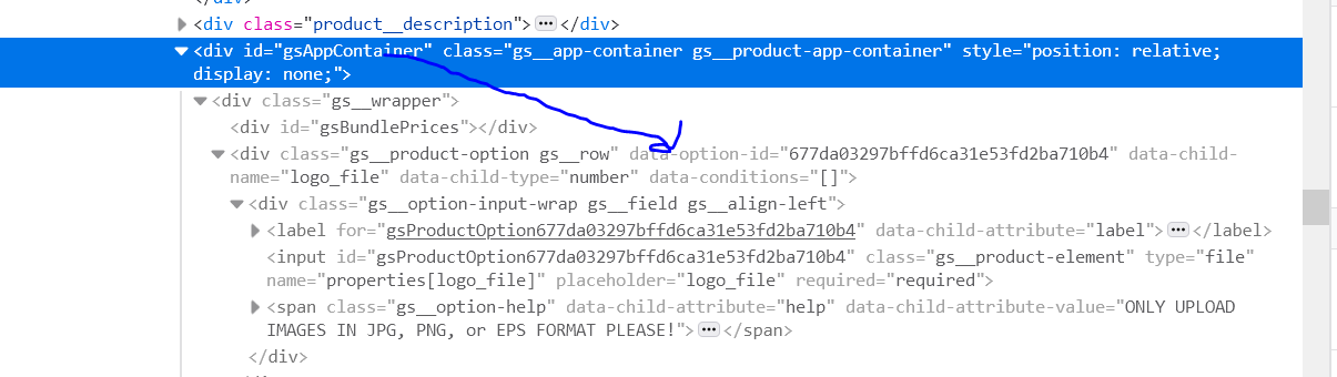 With the code below, I’m hiding a product option from a Shopify app. I need to narrow down the CSS selector to a data-option-id attribute so that only that product option is hidden in case I add another option to the page.