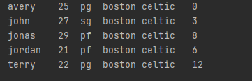 print(f"{table_data['name'][i]}\t {table_data['age'][i]}\t {table_data['position'][i]}\t {table_data['team'][i]}\t {table_data['number'][i]}")