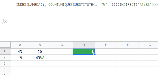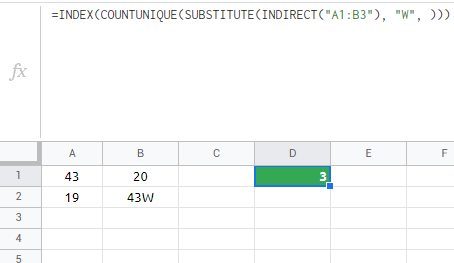 In the table below I am trying to get a COUNTUNIQUE formula working with INDIRECT("{RANGE}") that would show 3 unique numbers. Basically 43W and 43 need to reflect the same number.