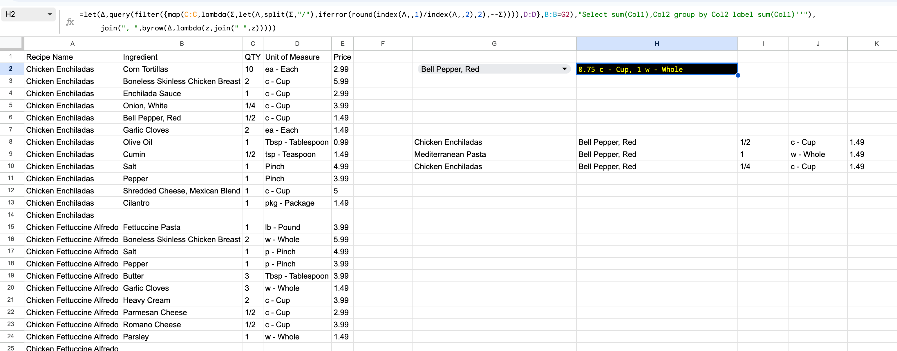 =let(Δ,query(filter({map(C:C,lambda(Σ,let(Λ,split(Σ,"/"),iferror(round(index(Λ,,1)/index(Λ,,2),2),--Σ)))),D:D},B:B=G2),"Select sum(Col1),Col2 group by Col2 label sum(Col1)''"),