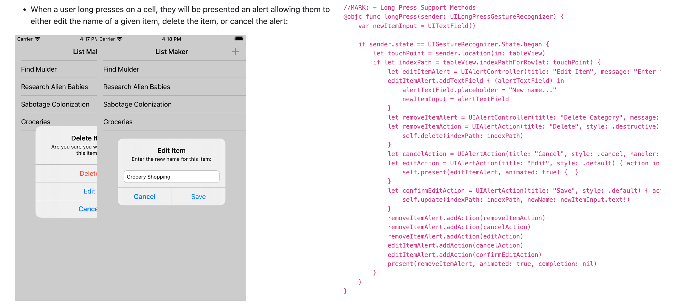 When a user long presses on a cell, they will be presented an alert allowing them to either