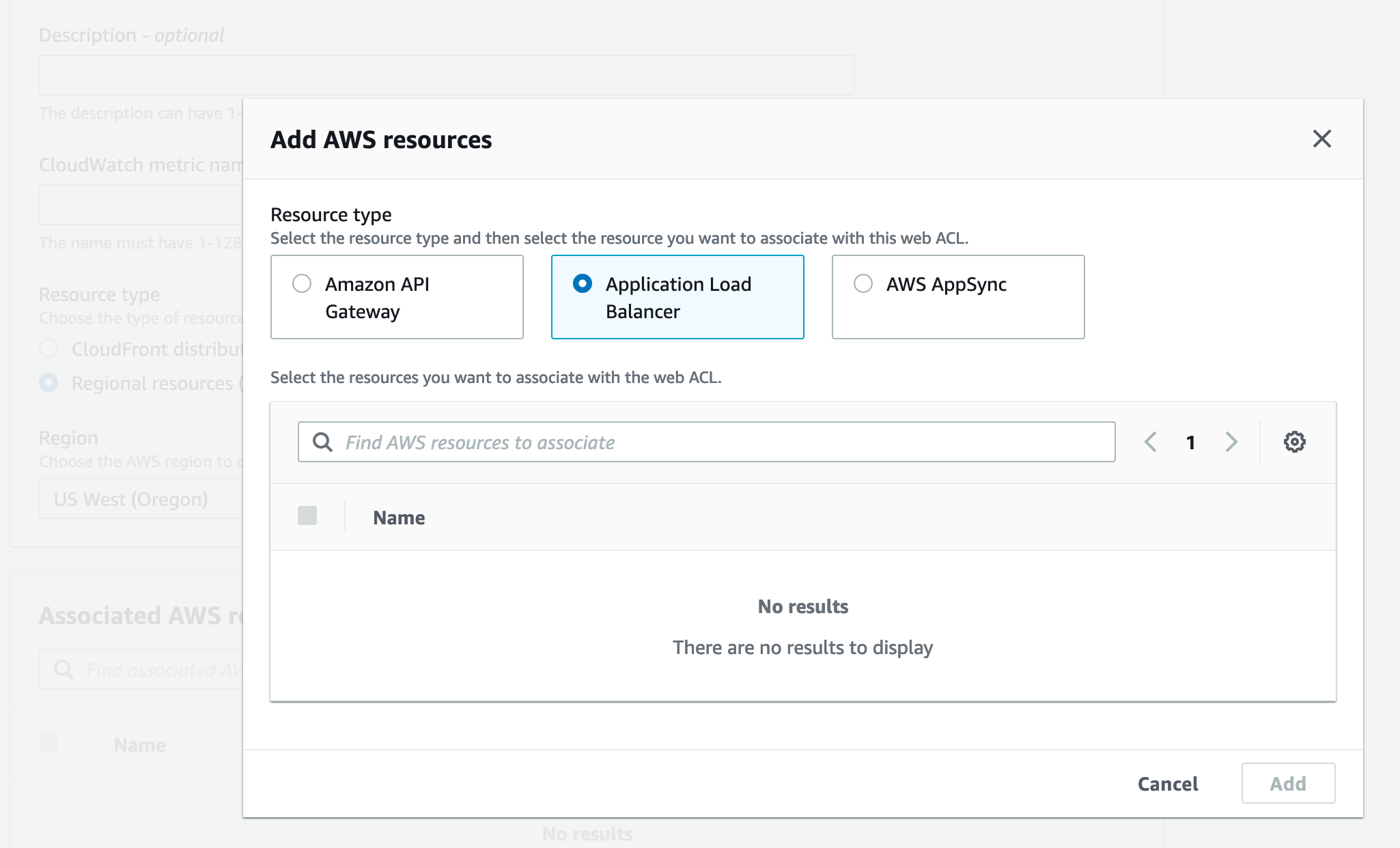 I’m trying to set up an ACL for a load balancer, but it does not show up in the Associated AWS resources section when creating the web ACL.