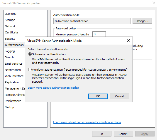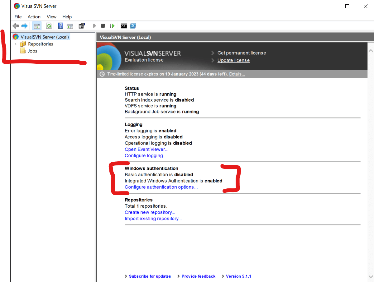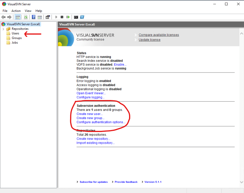 I have downloaded VisualSVN Server, version 5.1.1. In the left panel there is only Repositories and Jobs. I want to add new users for learing and testing purposes. However I can’t see any settings to do so. I currently dont have a licence. Is this the main reason? If not, how can I enable Users and Groups folders or how can I reach to related settings? Keep in mind that I’m a completely newbie to this application. Any help is appreciated, thanks