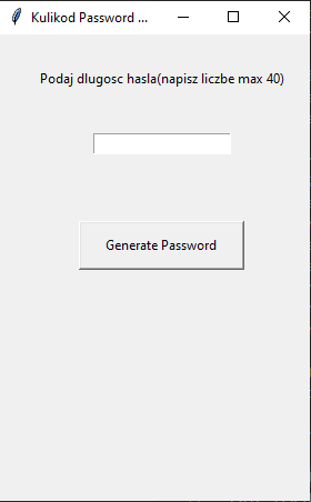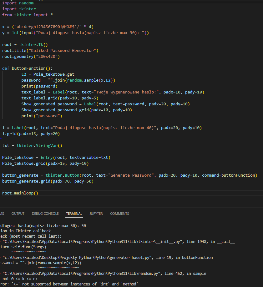 >! How to fix this error? I wanted to make this application in such a way that when you enter into Text_Field = Entry (root, textvariable = txt), e.g. the number 20, a 20-character password is generat