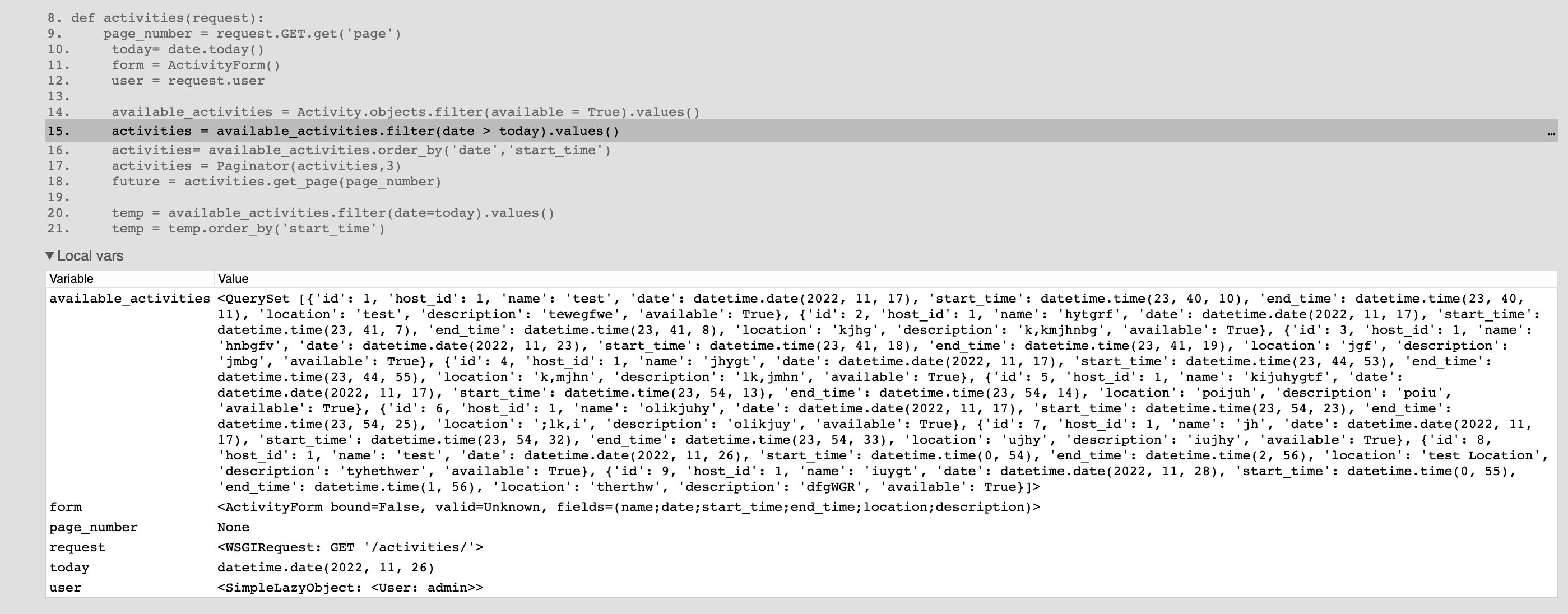 I’m creating a CRUD application that displays activities available on or after today; I’m working through the filtering mechanism on displaying these activities, however I’m having a nightmare trying to only show the activities that are on/after today.