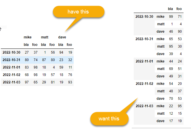 I can’t figure out the correct incantation of melt/stack/unstack/pivot to move from what i have to what i want. Unstacking() turned things into a series and lost the original date index.